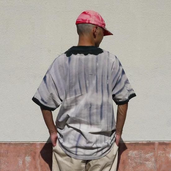 ムラ感が出るよう一度色を抜き、その後リンガーTシャツモチーフに染め上げました。